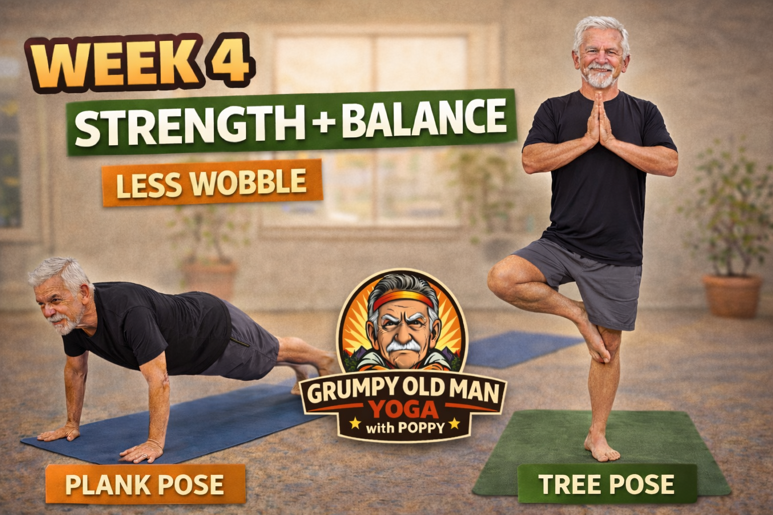 Grumpy Old Man Yoga is a beginner-friendly mobility and strength program designed specifically for men who may be stiff, sore, or new to yoga. The program improves flexibility , balance, and joint mobility while reducing stress and helping participants move better in everyday life and sports like golf.
